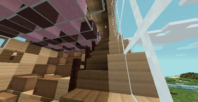 2012/11/22 Category : 箱庭の一隅にて ―minecraft プレイ雑記― 屋宇(おくう) 漸(ようや)っと拠点となる家が容(かたち)と成った。新天地であるから、今迄使用してこなかったジャングルの木材を主とする想を練った。また屋根は、これもまた敬遠してきた三角屋根に取り組むことにした。構想上では、一階の壁面は爆破耐性が高いものと考えていたが、石材が不足。階段や二階の床となる一階の天井は試行錯誤の連続だった。模索の末に、徹底的にジャングルの木材を多用したログハウスと到(いた)った。尚、今回より使用テクスチャはPaper Cut-Outである。